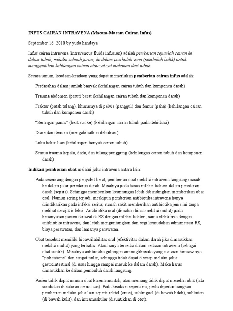 Apabila tekanan cairan infus lebih tinggi maka cairan infus akan keluar dari sel darah. Bila faktor tetesan makro. Ada berbagai jenis cairan infus yang seringkali digunakan.